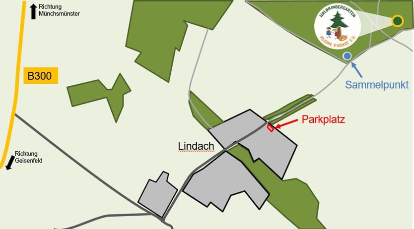 Mit dem Auto von Geisenfeld kommend, auf der Bundesstraße 300 in Richtung Münchsmünster fahren. Nach Engelbrechtsmünster geht es auf halbem Weg nach Straßberg rechts nach Lindach ab. Nach ca. 500 m biegt man links nach Lindach ein. Ab da, folgt man der Straße immer gerade bis zum Beginn einer Allee. Hier befinden sich rechterhand unsere Parkplätze und von dort, sind es nur noch wenige Gehminuten (ca. 5 min.) durch die Allee und dem Weg rechts haltend bis zu unserem Unterschlupf. Das Gelände unseres Waldkindergarten befindet sich dann links des Forstweges.